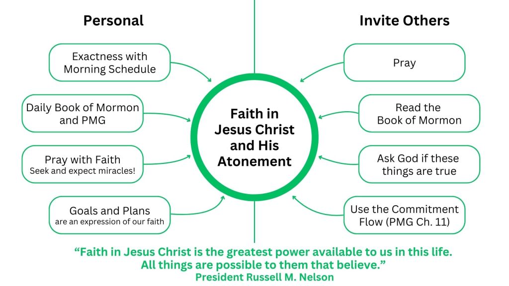 The main focus is increasing our own faith, repentance, keeping covenants, following the Holy Ghost, and enduring as missionaries. We then walked through the commitments we would need to make in applying the Doctrine of Christ to build our faith and seek these miracles.