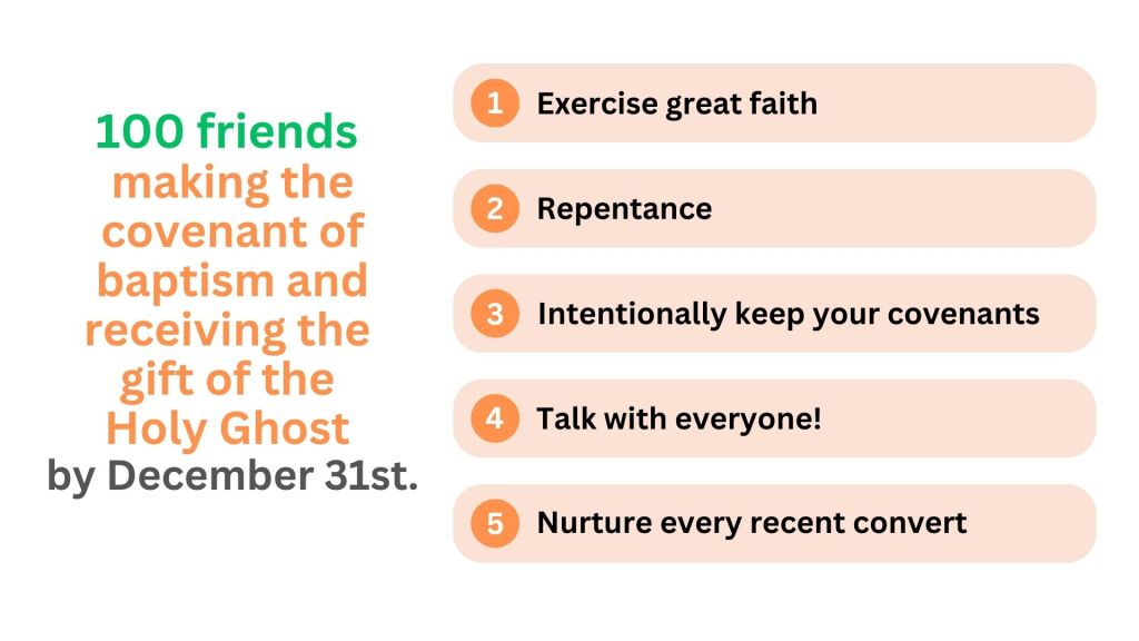 As President Nelson said, the Lord is hastening His work. We should not let the probabilities limit the possibilities! Now is the time for us as a mission to increase our faith, and learn to act in greater faith. In preparation for the zone conference, the mission studied President Nelson’s talks “The Power of Spiritual Momentum” and “Christ is Risen; Faith in Him Will Move Mountains“. We discussed the ways that we can increase our faith and act in greater faith as missionaries. We then shared with the mission that we felt the Lord wanted us to work towards a goal that would require more faith, and we felt that goal should be 100 friends making the covenant of baptism and receiving the gift of the Holy Ghost by the end of the year. This is far greater than what we have seen previously, but do not let the probabilities limit the possibilities!