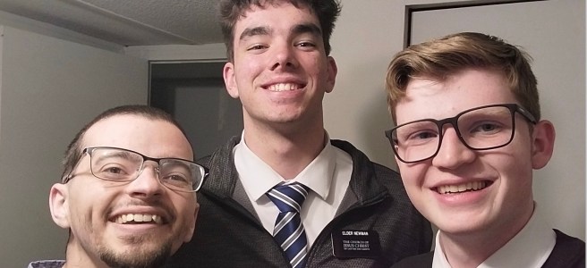 The missionaries first met Ian in the parking lot at TJ Maxx where they were handing out cards to invite people to the Tabernacle Choir Watch Party.