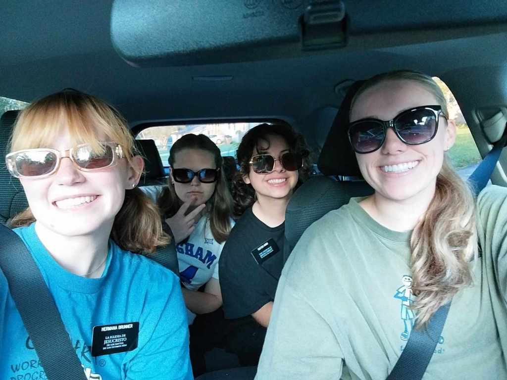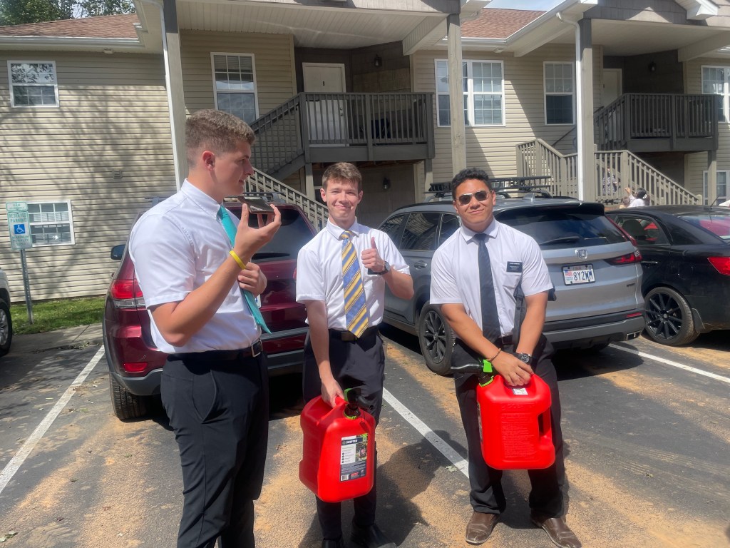 Our final stop was the Arden building in Asheville where we would meet the Asheville sisters, Sister Hall and Sister Low, and Asheville Spanish elders, Elder Richins and Elder Safsten. When we arrived, we saw President Gillett, the stake president of the Asheville Stake. He had a Starlink internet satellite receiver set up on his car and was in communication with leaders throughout the stake who were providing reports on members and their needs. Also there were the Weaverville sisters, Sister Avei and Sister Harris, and the Marion sisters, Sister Hunt and Sister Herget. All were in good spirits. It felt so good to lay eyes on all these missionaries in Asheville. We gave them groceries, water, gas, and cash as well.